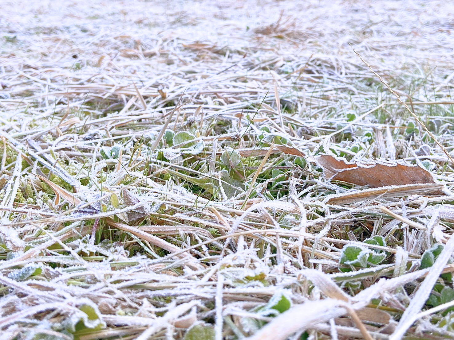 写真は、南天と、早朝の霜です。